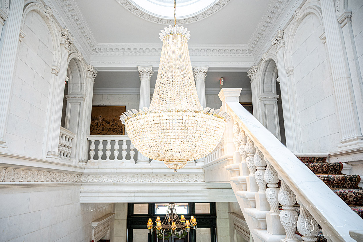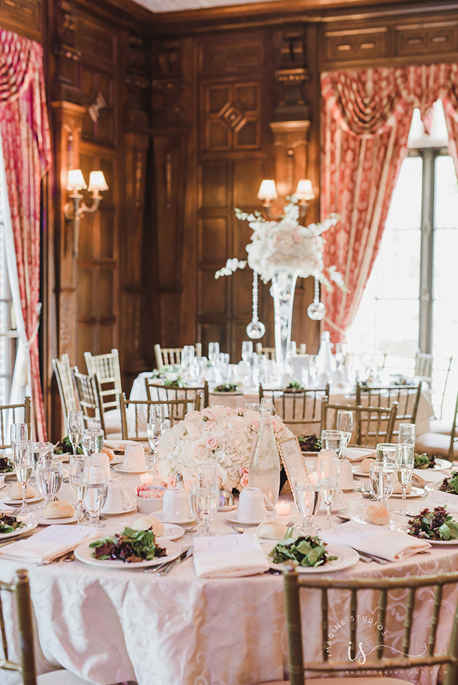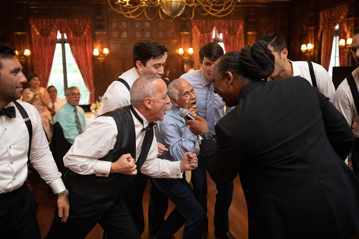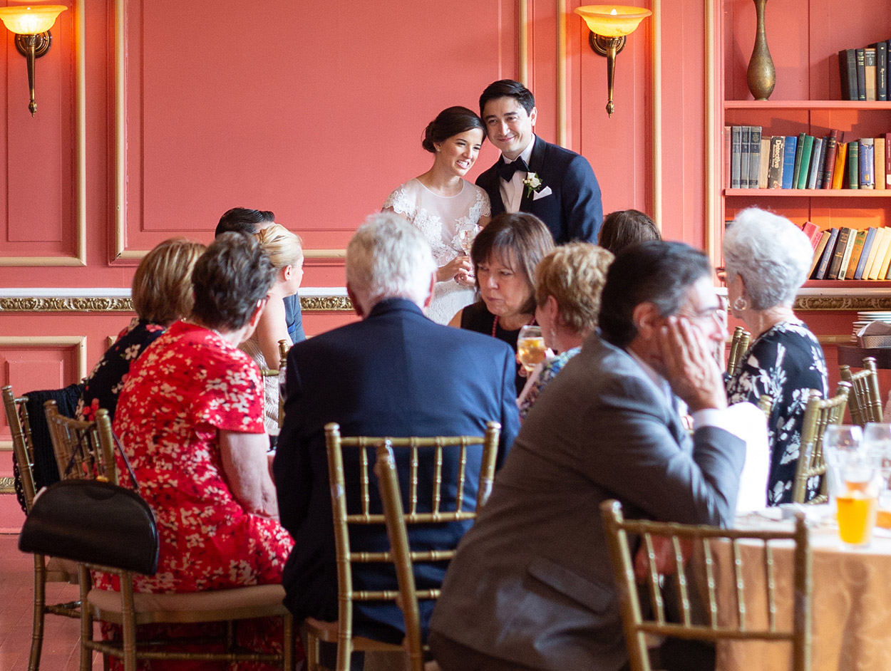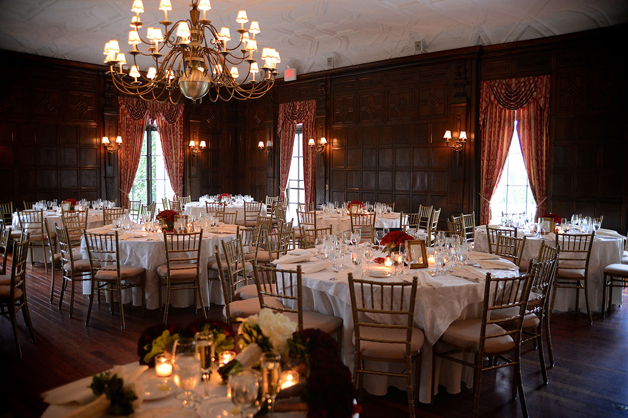 If your preference is to stay with a customary reception, as you enter the Grand Foyer, our team will escort you to cocktail hour in the heart of the mansion. A three-course dinner and dancing immediately follows in our Grand Ballroom, at which time your guests will experience formalities, dinner, and entertainment right from their table throughout the event. Seating outside is also available on the East Colonnade, with ambience provided by outdoor fire pits.